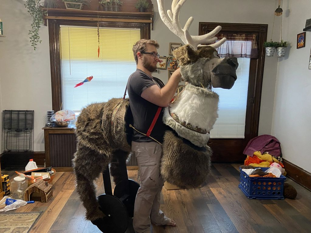 Sven - cardboard, Bondo, styrofoam, plastic ornamants, PVC, metal rod, wood, paper mache, rope, plexiglass, fur, felt, fabric strapping, acrylic